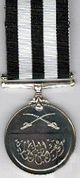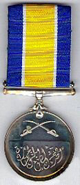 Médaille des Services Emérites La Médaille des Services émérites est attribuée aux Soudanais et étrangers ayant accompli des efforts exemplaires et méritants au bénéfice de l'état soudanais. Le corps d'appartenance du titulaire de cette médaille est indiqué par des rubans de couleurs différentes : le ruban militaire est composé de 5 bandes noires et blanches égales et alternées (ici à gauche) ; le ruban de la police est jaune à bandes latérales bleues, séparées par des raies blanches (ici à droite) ; le ruban des forces pénitentiaires est vert à bandes latérales rouges, séparées par une ligne blanche (non représenté).