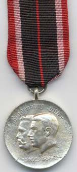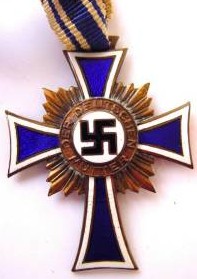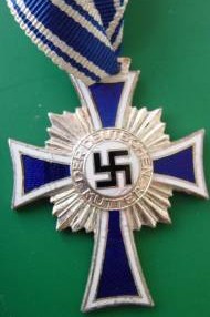 Allemande. Trois classes : Or (8 enfants), Argent (6 enfants) et Bronze (4 enfants). Il existe 2 modèles de cette médaille ; c'est l'inscription de l'envers qui les différencie ; lun est signé de Hitler lui-même. Sont ici présentées les classes bronze et argent. créée le 16 décembre 1938