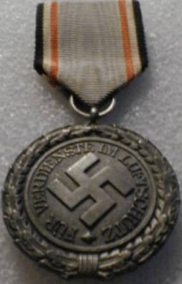 Luftschutz Ehrenzeichen Insigne d'Honneur de la Protection aérienne créé le 30 janvier 1938 pour 4 années de service au sein ou au service de la protection aérienne. 2 échelons : Croix du 1er échelon à gauche et médaille du 2ème échelon à droite. |