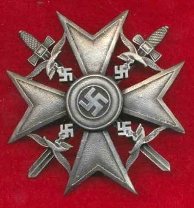 Croix d'Espagne en argent avec glaives créée le 14 avril 1939 pour récompenser les personnes ayant fait partie du corps expéditionnaire allemand en Espagne (la Légion Condor) en 1936 - 1939. 3 classes et 2 catégories (combattants avec épées et non combattants)