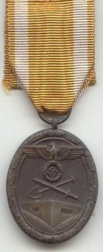 Médaille du Mur de l'Ouest (Ligne Siegfried puis Mur de l'Atlantique) créé le 2 août 1939 pour récompenser un minimum de 10 semaines de travail ou 3 semaines de surveillance de chantier. |