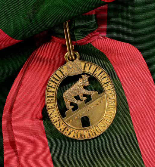 ORDRE d'ALBERT L'OURS Fondé le 18 novembre 1836 par Henri-Léopold Frédéric et Alexandre-Charles, Ducs souverains d'Anhalt. Les statuts en ont été modifiés le 24 février 1850, le 20 août 1863, le 18 juillet 1864 et le 20septembre 1875. Cet Ordre a pour but de témoigner "une marque d'estime aux personnes qui se distinguent par leurs vertus et leurs mérites". Trois classes, dont les deux dernières se subdivisent en deux grades : Grand-Croix (écharpe et plaque), Commandeurs de 1ere classe (sautoir et plaque), Commandeurs de 2nde classe (sautoir sans plaque), Chevaliers de 1ere classe (boutonnière avec Croix d'or), Chevaliers de 2nde classe (boutonnière avec Croix d'argent). Ruban vert foncé bordé de bandes rouge ponceau. |