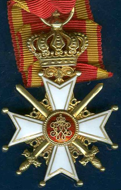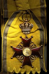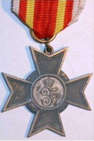 ORDRE du Mérite Militaire de Charles - Frédéric Fondé le 4 avril 1807 par le Grand-Duc du même nom pour récompenser les services militaires et les vertus guerrières. A l'Ordre est annexé une Médaille Militaire (1° classe en or, 2° classe en argent). Trois classes : Grand-Croix (écharpe et plaque), Commandeur (sautoir) et Chevalier (boutonnière). Ruban jaune avec une large bande rouge au milieu et un étroit liseré blanc sur chaque bord du ruban.