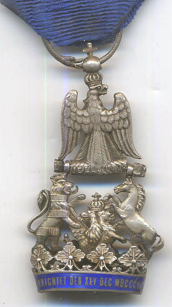 ORDRE de la COURONNE de WESTPHALIE Ordre créé par Jérôme Bonaparte (frère de Napoléon Ier), Roi de Westphalie, le 25 décembre 1809 (Statuts du 5 février 1810) et abandonné le 26 octobre 1813, lors de la chute du Roi Jérôme. Le Roi Jérôme, prudent, avait demandé à son frère Napoléon Ier l'autorisation de créer un Ordre pour son Royaume, ce qui lui fut accordé. Quand on lui présenta la maquette de l'insigne, Napoléon moqueur, trouva "qu'il y avait bien des bêtes dans cet Ordre là" ! L'Ordre comprenait principalement 300 Chevaliers et 10 Grands-Commandeurs. La décoration était en or pour les trois premiers grades et en argent pour le quatrième. Le ruban est gris-bleu moiré. Etaient institué également un costume de cérémonie, un Grand Collier et une Chancellerie de l'Ordre. L'Ordre fut définitivement aboli par le Roi Louis XVIII le 19 juillet 1814 et défense fut faite d'en prendre le titre et d'en porter la décoration.