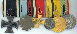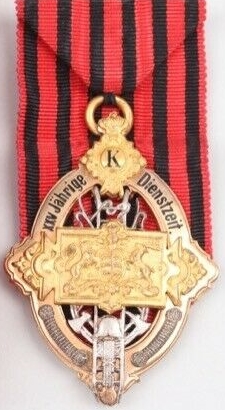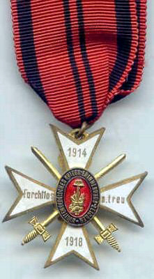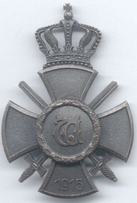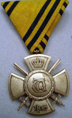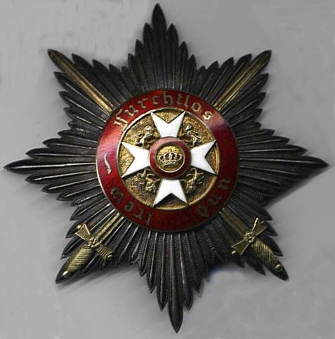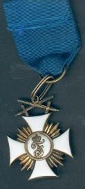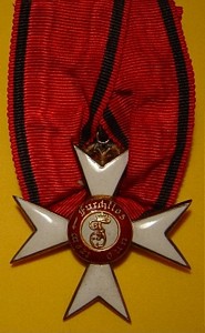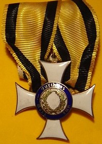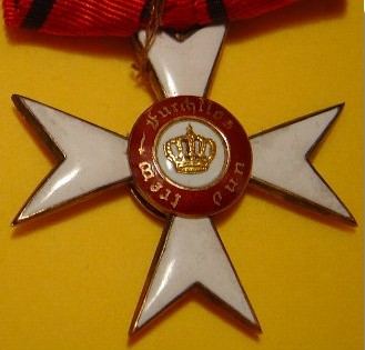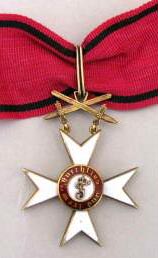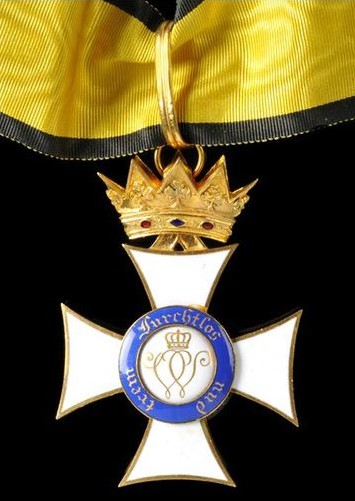 ORDRE de la COURONNE de WURTEMBERG Fondé le 23 septembre 1818, modifié le 22/12/1864 et le 19/09/1870. Statuts du 18/02/1890. Les quatre premières classes conféraient la noblesse personnelle. 5 classes : Grand-Croix, Commandeur avec plaque, Commandeur, Chevalier d'Honneur, Chevalier. Pour Mérites Militaires, la décoration comprenaient des épées entrecroisées. Deux médailles, l'une en or et l'autre en argent étaient annexées à l'Ordre. Ruban rouge liseré de noir. |