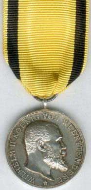 ORDRE du MÉRITE MILITAIRE Fondé le 11 février 1759 par le Duc Charles-Eugène, renouvelé en 1799, confirmé en 1806, statuts de 1818. Trois classes : Grand-Croix, Commandeur et Chevalier. Il existe plusieurs modèles différents, selon les époques et les Rois régnants (monogramme W, FR, KR, WR). Il y a des médailles avec la croix boulée et l'inscription "Bene Merentibus" écrite sur les branches en lettres d'or. A l'origine, le ruban était bleu foncé.