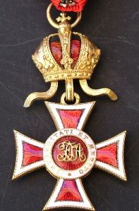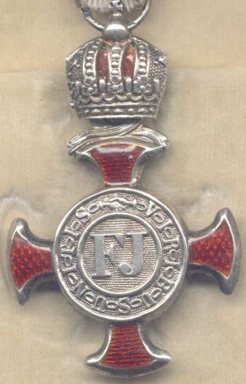 CROIX de MÉRITE Fondé le 16 février 1850 par l'Empereur François - Joseph I° pour récompenser les services rendus dans les emplois civils. Cet Ordre comporte quatre classes de Chevaliers, tous portant la décoration sur la poitrine. Première classe = croix d'or avec couronne en or ; 2° classe = croix d'or sans couronne ; 3° classe = croix d'argent avec couronne en argent ; 4° classe = croix d'argent sans couronne. Il s'agit donc ici de croix de 1° et de 3° classe. Ruban rouge foncé.