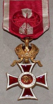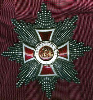 ORDRE de LÉOPOLD Fondé le 8 janvier 1808 par l'Empereur François I°, le jour de son mariage avec l'Archiduchesse Louise d'Autriche - Modène et en l'honneur de son Père. Il avait pour but de récompenser "tous ceux, civils et militaires, qui contribuent au bien de l'Etat, soit dans les arts, soit dans les sciences, soit autrement". L'Ordre comporte 3 classes : Grand - Croix, Commandeur et Chevalier. Les membres de la première classe ont le titre de "conseillers privés", ceux de la seconde classe recoivent le titre de "Barons" et ceux de la troisième classe obtiennent la noblesse héréditaire. Les décorés en temps de guerre devant l'ennemi, ajoutent à la croix une couronne de lauriers émaillée de vert. Ruban rouge avec une raie blanche sur chaque bord.