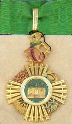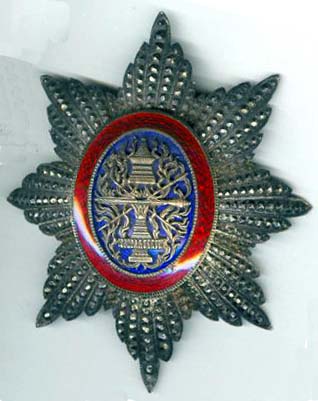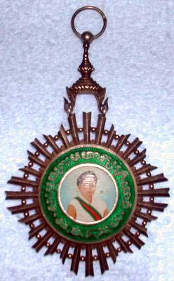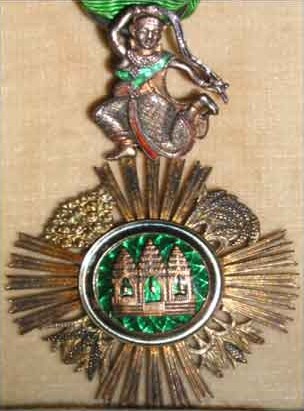 ORDRE ROYAL du MUNISÉRAPHON Créé le 1° février 1905 par Ordonnance Royale, cet Ordre est destiné à récompenser les Cambodgiens ou étrangers d'origine cambodgienne, qui se distinguaient dans le domaine historique, littéraire et scientifique. L'Ordre, qui ne comportait qu'une seule classe à l'origine fut étendu à 3 classes en 1948 puis à 5 classes en 1961. Abandonné par les Khmers Rouges en 1975, l'Ordre fut rétabli par Décret Royal du 5 octobre 1995, comme Ordre destiné à récompenser les mérites dans les domaines de l'Education, de la littérautre, des sciences, des arts et du travail associatif. |