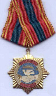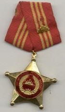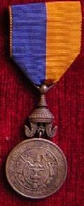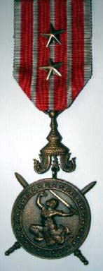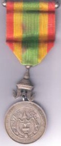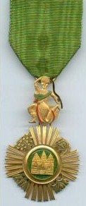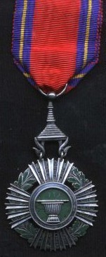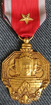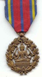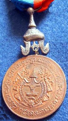 3 grades : Bronze, Argent et Or. Une rosette figure sur le ruban de la médaille d'or. Ruban rose à liserés bleus. Supprimée par le gouvernement Khmer rouge et non rétablie. |