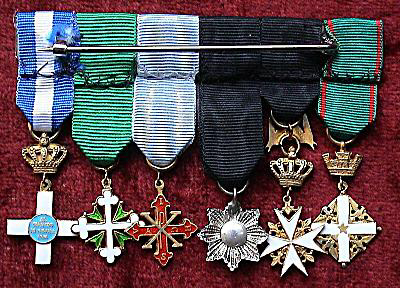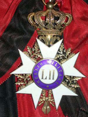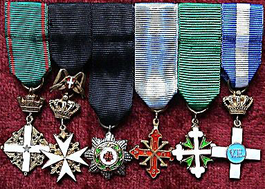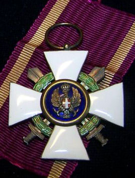 ORDRE MILITAIRE DE SAVOIE Fondé le 14 août 1815 par le Roi de Sardaigne Victor-Emannuel I°, l'Ordre fut modifié à plusieurs reprises. L'Ordre a pour vocation de récompenser les militaires qui se distinguent par des actions d'éclat, leur bravoure, leur courage ou leurs talents dans l'art de la guerre. Il comporte cinq classes : Grand-Croix, Grand-Officier, Commandeur, Officier et Chevalier. Les trois premières classes ont leurs insignes surmontés de la couronne royale, celle des Officiers est surmontée d'un trophée de drapeaux et celle des Chevaliers d'un unique anneau. Le ruban est à trois bandes égales bleue - rouge - bleue.