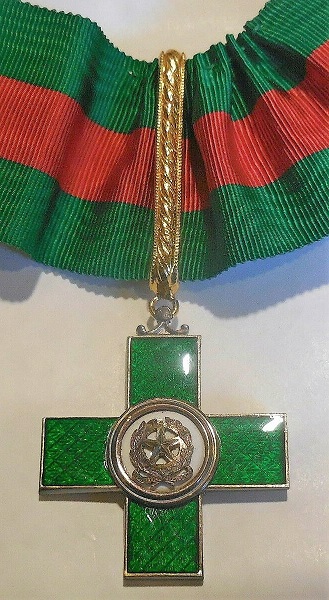 ORDRE NATIONAL du MÉRITE Créé le 3 mars 1951, cet Ordre, le premier de la République Italienne n'a été fondé que cinq ans après la proclamation de la République. Il est destiné à récompenser tous les services exceptionnels, tant militaires que civils. Le premier modèle (à gauche) représente une croix grecque d'or aux branches émaillées de blanc et terminées d'une boule. Les intervalles sont remplis par 4 Aigles Romains en or. Une étoile d'or occupe le centre de la croix tant à l'avers qu'au revers. Le tout est surmonté d'une couronne murale en or. Le ruban est vert moiré avec une raie rouge sur chaque côté. L'Ordre comporte 5 classes. Le second modèle (à droite), datant de 2002, rappelle également l'Ordre de la Couronne d'Italie (Cf. ci-dessus).
