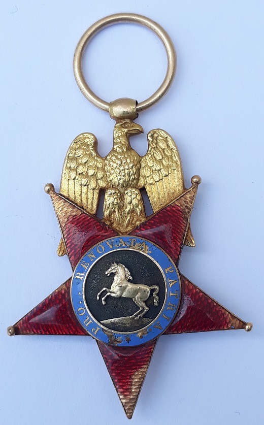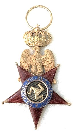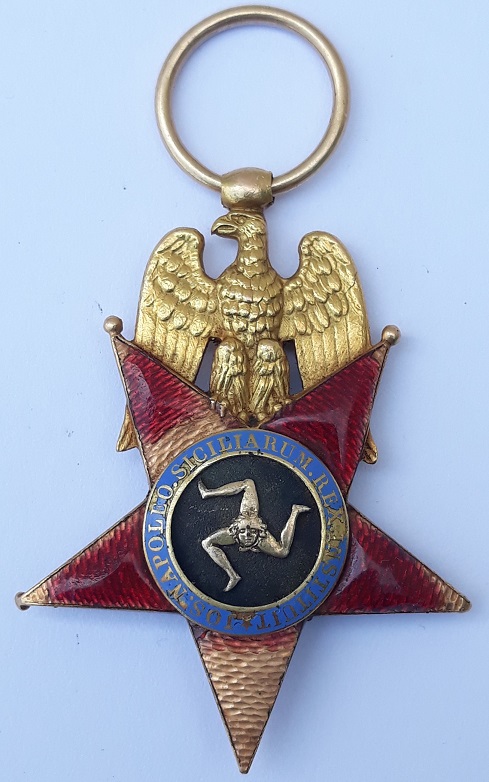 ORDRE ROYAL DES DEUX SICILES L'Ordre fut créé par Joseph BONAPARTE, Roi de Naples, le 24 février 1808 pour récompenser les Italiens qui avaient rendu d'importants services au Royaume. A l'origine, l'Ordre était divisé en 650 Chevaliers, 100 Commandeurs et 50 dignitaires. Son Grand Chancelier était Tommaso SANSEVERINO, Prince de Bisignano.Quand Joseph pris la couronne d'Espagne, c'est son beau-frère Joachin MURAT qui lui succéda comme Roi de Naples. Dès son arrivée, le 5 novembre 1808, MURAT réforma l'Ordre : il calqua l'Ordre sur celui de la Légion d'Honneur en créant 5 classes au lieu des trois existantes. En 1815, à la chute de l'Empire et du Royaume de Naples, le Roi Ferdinand Ier des Deux-Siciles conserva l'Ordre par un décret du 4 juin 1815. Mais, en 1819, l'Ordre fut aboli et remplacé par l'Ordre Royal et Militaire de Saint-Georges de la Réunion. Les titulaires de l'Ordre des Deux-Siciles reçurent le nouvel ordre en remplacement. Les bijoux sont en or avec un ruban bleu clair mais on trouve aussi des rubans bleu foncé et bleu-rouge-blanc-bleu. Les cinq branches sont émaillées de rouge. Sous le Roi Joseph, l'insigne présentait au recto : les armes de la Sicile (trinacrie sur fond or), entourées de l'inscription "Sicil rex instituit" ou "Jos. Napoleo. Siciliarum. rex. Instituit" ; au verso les armoiries de Naples (cheval cabré sur fond or), avec l'inscription "Pro renovata Patria". Devenu Roi de Naples, MURAT changea la légende de recto en "Joachim Napoleo Sicil Rex" et la Trinacrie fut rempllacée par le portrait d'or du roi Jaochim MURAT. Sous Ferdinand Ier, l'aigle surmontant l'insigne fut remplacé par une couronne et il remplaça les devises par la sienne "Ferdinandus Boronius utriusque Siciliae Rex PFA" et au verso par "Felicitati restituta X Kal., Jun. MDCCCXV". Le 25 mars 2017, Joachim MURAT, 8ème Prince MURAT, a rétabli l'Ordre lors d'une cérémonie au cours de laquelle un certain nombre de personnalités furent élevées au rang de Chavaliers ou Commandeurs. Ici, insigne très rare du 1er type (Règne de Joseph BONAPARTE). Collection privée et photo de Monsieur Bruno X. Grand merci à lui. |