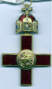 ORDRE MILITAIRE ROYAL DE SAINT GEORGES DE LA RÉUNION Il fut créé le 1er Janvier 1819 par Ferdinand Ier Roi des Deux-Siciles pour couronner la valeur et le mérite militaire. Il doit son nom à la réunion des domaines de Naples et de Sicile en un seul Royaume. Les statuts furent réformés en 1829 et en 1850. L’Ordre est divisé en huit Grades: Chevaliers de Grand-Croix, avec ruban de cou, croix et plaque - Grands-Officiers, avec ruban de cou, croix sans le Saint Georges et plaque plus petite - Commandeurs, avec ruban de cou et croix - Officiers, avec ruban, petite houppe et croix à la boutonnière - Chevaliers de Droit, avec ruban et croix à la boutonnière - Chevalier de Grâce, avec ruban et croix à la boutonnière - Médaille d’or - Médaille d’argent. Pour les Chevaliers de Grand-Croix, sur la branche inférieure de celle-ci, pend l’image de Saint Georges en or, le tout surmonté de la Couronne Royale. Le ruban est bleu ourlé de jaune. Le Grand Maître actuel est S.A.R. le Prince Ferdinand de Bourbon des Deux-Siciles, Duc de Castro. |