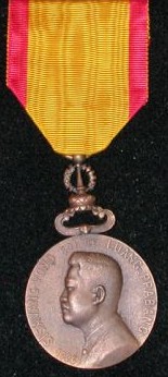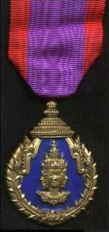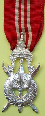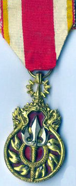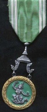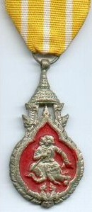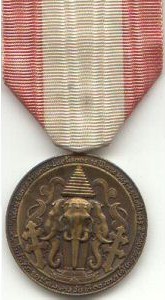 Ordre du Règne du Roi SAVANG VATTHANA Cet ordre fut créé en 1927 et comporte 3 classes (Or, Argent et Bronze). Médaille de bronze du troisième et dernier type. |