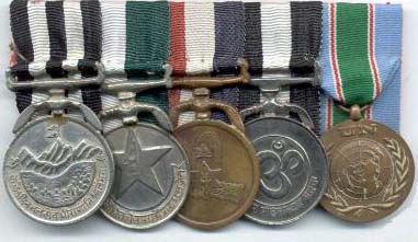 Les médailles sont, de gauche à droite Service en haute altitude ; Services Extérieurs ; Services Militaires 10 ans ; tremblement de terre de 1988 ; ONU Liban
