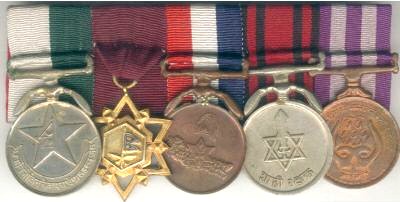 Les trois premières médailles sont, de gauche à droite la "Paradesha-Seva Padaka" - la "Sainika-Deergha-Seva Padaka" et la "Sainika-Seva Padaka" .