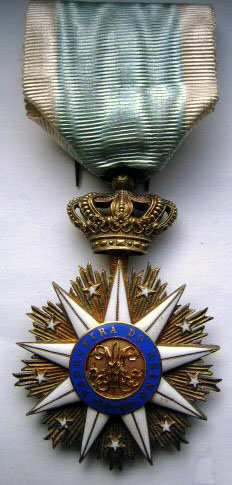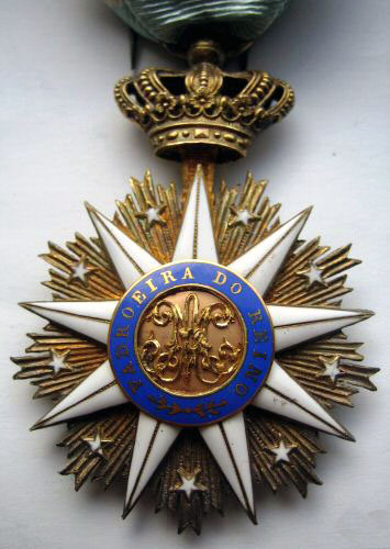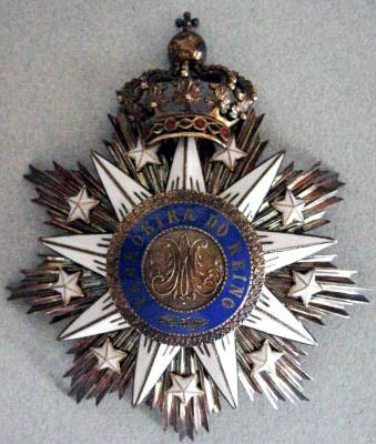 ORDRE de NOTRE - DAME de la CONCEPTION de VILLA - VICOSA Ordre fondé par le 6 février 1818 par le Roi Jean VI. Statuts de 1819. Cet Ordre comporte 3 classes comprenant des membres titulaires et des membres honoraires. L'effectif des décorés était contingenté pour les membres honoraires à 12 Grands-Croix, 40 Commandeurs avec plaque et 100 Chevaliers. Ruban bleu azur avec un liseré blanc de chaque côté.
