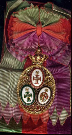 MÉDAILLON des TROIS ORDRES Les Rois du Portugal étaient les Grands Maîtres des trois Ordres qu'étaient : l'Ordre de Saint-Benoît d'Aviz, l'Ordre de Saint-Jacques de l'Epée et l'Ordre du Christ. Mais ils ne portaient que la Grand-Croix du Christ. A partir de 1789, ils portèrent les trois Ordres réunis dans un seul médaillon suspendu à un ruban à trois raies égales verte, rouge et violette. Une plaque diamentée porte au centre les trois Ordres en réduction ce qui permet aux décorés de ces trois Ordres de ne porter qu'une seule décoration. (Photos : Musée Royal de l'Armée belge)