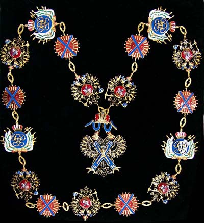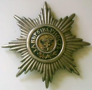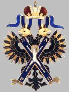 ORDRE de SAINT ANDRÉ Fondé le 11 décembre 1698 par le Tsar Pierre I°, c'est le premier Ordre Russe, il est ordinairement réservé aux Souverains. Une seule classe de Chevaliers qui se trouvent de droit Chevaliers des Ordres de Saint Alexandre Newski, de l'Aigle Blanc et Grands-Croix des Ordres de Sainte-Anne et Saint-Stanislas. Décoration portée comme les Grands-Croix, avec une plaque d'argent. Ruban bleu azur.