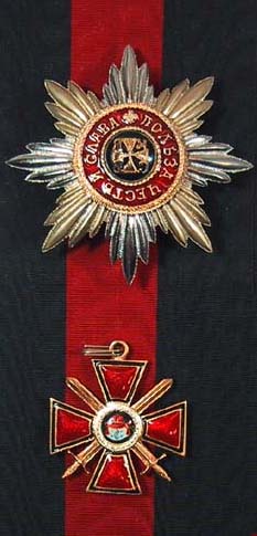 ORDRE de SAINTE-ANNE Fondé à Kiel le 14 février 1735 par Charles - Frédéric, duc de Holstein-Göttorp. Réuni aux ordres russes par l'Empereur Paul I° en 1796. Cet Ordre comporte trois classes : 1° Classe (Grand-Croix) ; 2° Classe ( Commandeur) ; 3° Classe (Chevalier). En outre, il existe une 4° Classe qui porte la décoration émaillée sur l'épée et une 5° Classe qui a une médaille (Cf. les médailles ci-dessous). La décoration existe en émail rouge ou noir.