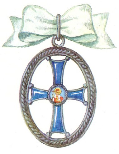 INSIGNE D'HONNEUR de SAINTE OLGA (Pour les dames) La création d'un Ordre dédié exclusivement aux femmes fut étudié à partir de 1907, date de la création de la Société de Sainte - Olga. L'Ordre futur devait récompenser les actes méritoires comme l'action en faveur de l'Orthodoxie, les services rendus au gouvernement, la défense de l'Etat et du Pays, l'éducation des jeunes et les actions héroïques. De nombreux débats perturbèrent ce projet qui ne déboucha pas jusqu'en 1914. Les débuts de la 1° Guerre Mondiale contribuèrent à relancer l'idée de la création de cet Ordre. Des artistes furent alors priés de présenter des projets de décorations. A l'automne 1914, à l'issue d'un concours, quatre projets furent retenus par quatre personnalités différentes (Cf. ci-dessus). La défaite de l'Armée Russe et la Révolution Bolchevique de 1917 enterrèrent finalement ce projet qui ne put être décerné qu'à une seule personne : Madame Vera Nikolaevna PANAEVA. Cette femme perdit ses trois fils, tous trois officiers du 12° Régiment de Hussards (dit "Akhtyrsky Hussars"), durant les combats de 1914 et 1915. |