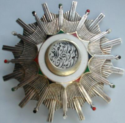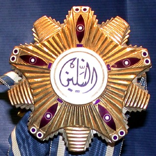 ORDRE de la RÉPUBLIQUE Créé en 1961 pour récompenser les Soudanais et les étrangers ayant rendus des services remarquables, civils ou militaires, au Soudan. L'Ordre comporte cinq classes. Ruban violet à lignes verticales vertes. |