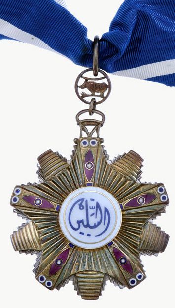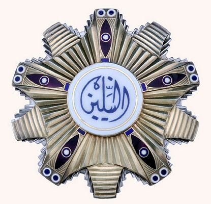 ORDRE DES DEUX NILS Créé en 1961 pour récompenser les mérites ne justifiant pas l'attribution de l'Ordre de la République. L'Ordre comporte cinq classes. Ruban bleu avec deux raies blanches. | ||