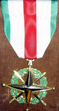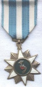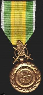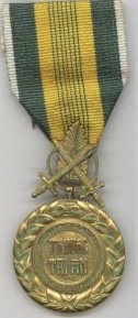 Médaille d'honneur des Forces Armées (médaille de 2° classe, pour sous-officiers. La médaille de 1° classe, pour officiers, est dorée et le ruban comporte un liseré jaune en plus sur chaque bord) créée en 1953 - 2 classes