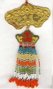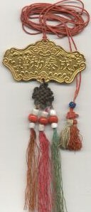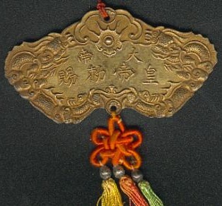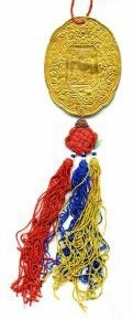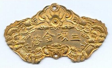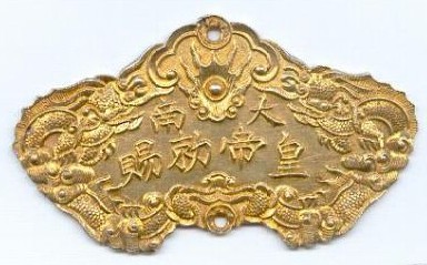 ORDRE du KIM KHAN (Gong d'Or) La date de création de cet Ordre par les Empereurs d'Annam est inconnue. Il était décerné par les souverains annamites en récompense des services exceptionnels rendus par les hauts mandarins civils et militaires. L'insigne se compose d'une plaque en or en forme d'éventail stylisé. Le pourtour porte des dragons symboliques laissant au centre des idéogrammes chinois. La passementerie du bas, à base de perles et de fils de soie, est variable suivant les classes. Sur l'avers de la plaque, figure le nom de l'Empereur régnant et au revers se trouve la devise de l'Ordre "Ornement des Dragons" ainsi que l'indication de la classe. Jusqu'en 1887, cet Ordre ne comportait que 2 classes mais