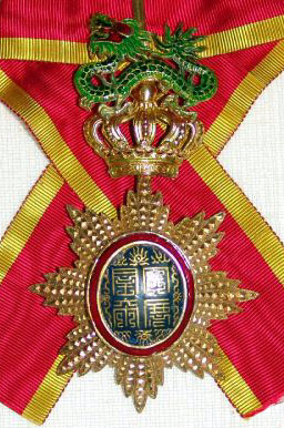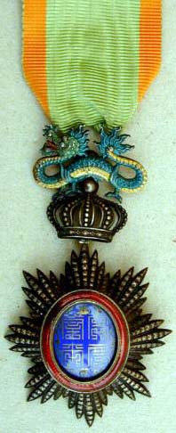 ORDRE du DRAGON La création de cet Ordre fut projetée en 1884 par le Ministre de la marine et Monsieur Patenotre lors du départ de ce dernier pour une mission à Hué, dans le but de récompenser les services rendus au protectorat. L'Ordre fut finalement institué à Hué le 14 mars 1886 par l'Empereur Dong - Khanh, en accord avec le gouvernement français. L'Ordre comporte 5 classes : Grand-Croix, Grand-Officier, Commandeur, Officier, Chevalier. Les rubans sont différents selon que l'ordre est conféré à des civils (vert à bords oranges) ou à des militaires (blanc à bords orange, puis rouge à bords oranges). Cet Ordre fit partie des Ordres Coloniaux français entre 1896 et 1950.