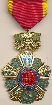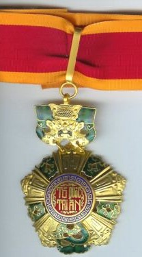 ORDRE NATIONAL Créé le 15 août 1950 par le gouvernement du Vietnam, cet Ordre était destiné à récompenser les services civils exceptionnels et les mérites militaires. L'inscription du centre "TO QUOC TRIAN" signifie "la Patrie reconnaissante". L'Ordre comporte cinq classes. Ruban rouge à deux raies jaune, une sur chaque bord.