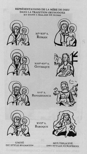 C'est pourquoi quand nous comparons, par exemple, les évolutions des peintures de la Vierge dans le monde occidental et dans le monde orthodoxe, nous voyons que, si dans le premier la peinture évolue au gré des temps, il n'en est pas de même dans le second :