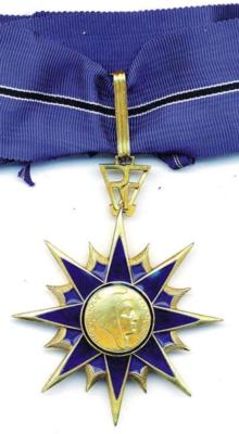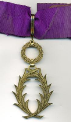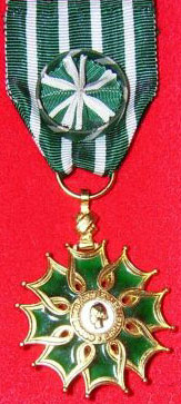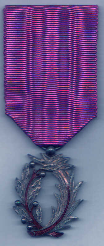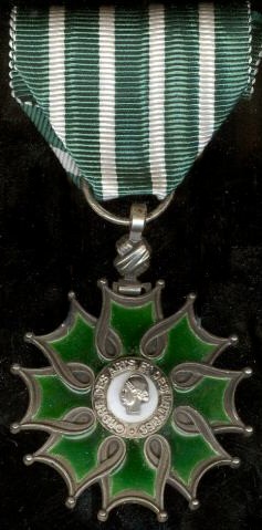 ORDRE DES PALMES ACADÉMIQUES Créé par décret en date du 4 octobre 1955, l'Ordre des Palmes Académiques est un descendant des titres honorifiques créés par Napoléon I° en 1808, lors de l'organisation de l'Université française. Les "Palmes Universitaires" ont en effet été instituées le 17 mars 1808 par le décret organisant l'université. Elles furent modifiées et réorganisées en 1846, 1850, 1866, 1880, 1885, 1898, 1921 et 1929. Les Palmes universitaires comportaient trois grades à l'origine : Titulaire, Officier de l'Université et Officier des Académies. L'insigne consistait en une double palme brodée sur la robe du professeur. En 1850, les grades furent ramenés à deux : Officier de l'Instruction Publique (bijou en or) et Officier d'Académie (bijou en argent). Un ruban violet fut créé pour soutenir le nouvel insigne métallique mis en place, car l'acces aux Palmes s'étant démocratisé, certains nouveaux décorés n'avaient pas d'uniforme professionnel (décret du 7 avril 1866). La nomination dans l'Ordre récompense les personnes ayant participé à la fonction enseignante et/ou au développement des connaissances humaines. Il peut donc s'agir des personnels de l'Education Nationale ou de tout autre organisme public ou privé ayant rempli ces conditions. L'Ordre comporte trois grades : Chevalier, Officier et Commandeur.