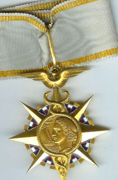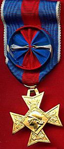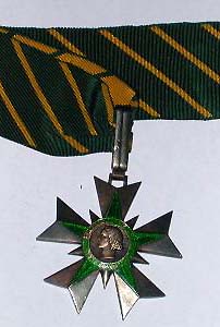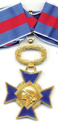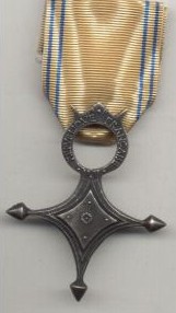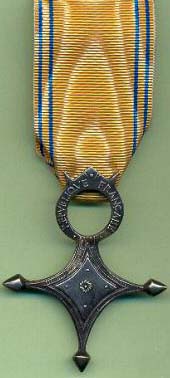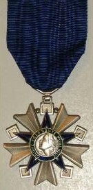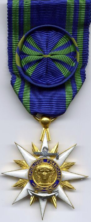 ORDRE DU MÉRITE MILITAIRE Créé par la Loi du 22 mars 1957, l'Ordre était destiné à récompenser, en temps de paix, les activités volontaires des cadres réservistes, dans l'instruction des Réserves et la préparation de la Défense Nationale. Il pouvait également être décerné aux cadres d'active participant à l'instruction des Réserves en dehors de leur emploi habituel. Cet Ordre remplaça la Croix des Services Militaires Volontaires (dont il reprit le dessin) créée en 1934. Après la disparition de l'Ordre en 1963, une nouvelle Médaille des Services Militaires Volontaires vit le jour en 1975. L'Ordre comportait trois classes : Chevalier, Officier et Commandeur. La croix de Chevalier était en argent, celle d'Officier était en vermeil. La croix de Commandeur était en or avec les branches émaillées de bleu et une bélière de feuilles de laurier.