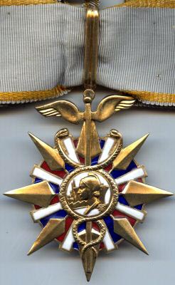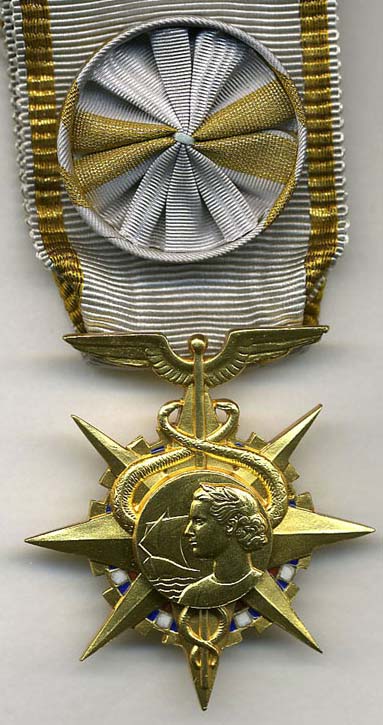 ORDRE DE LA SANTÉ PUBLIQUE Créé par Décret en date du 18 février 1938 et modifié par celui du 22 mai 1954, cet Ordre avait pour but de récompenser les personnes ayant rendu des services signalés à l'Assistance Publique, à l'Hygiène ou à la Protection de l'Enfance. Il remplaçait les Médailles d'Honneur de l'Assistance Publique, de l'Hygiène Publique et de la Protection de l'Enfance créées en 1891 et 1912. L'Ordre de la Santé Publique comprenait trois classes : Chevalier, Officier et Commandeur. Il était administré par le Ministre du Travail assisté d'un Conseil de l'Ordre. Le bijou est l'oeuvre du graveur Bazor d'après une maquette de l'affichiste Paul Colin.